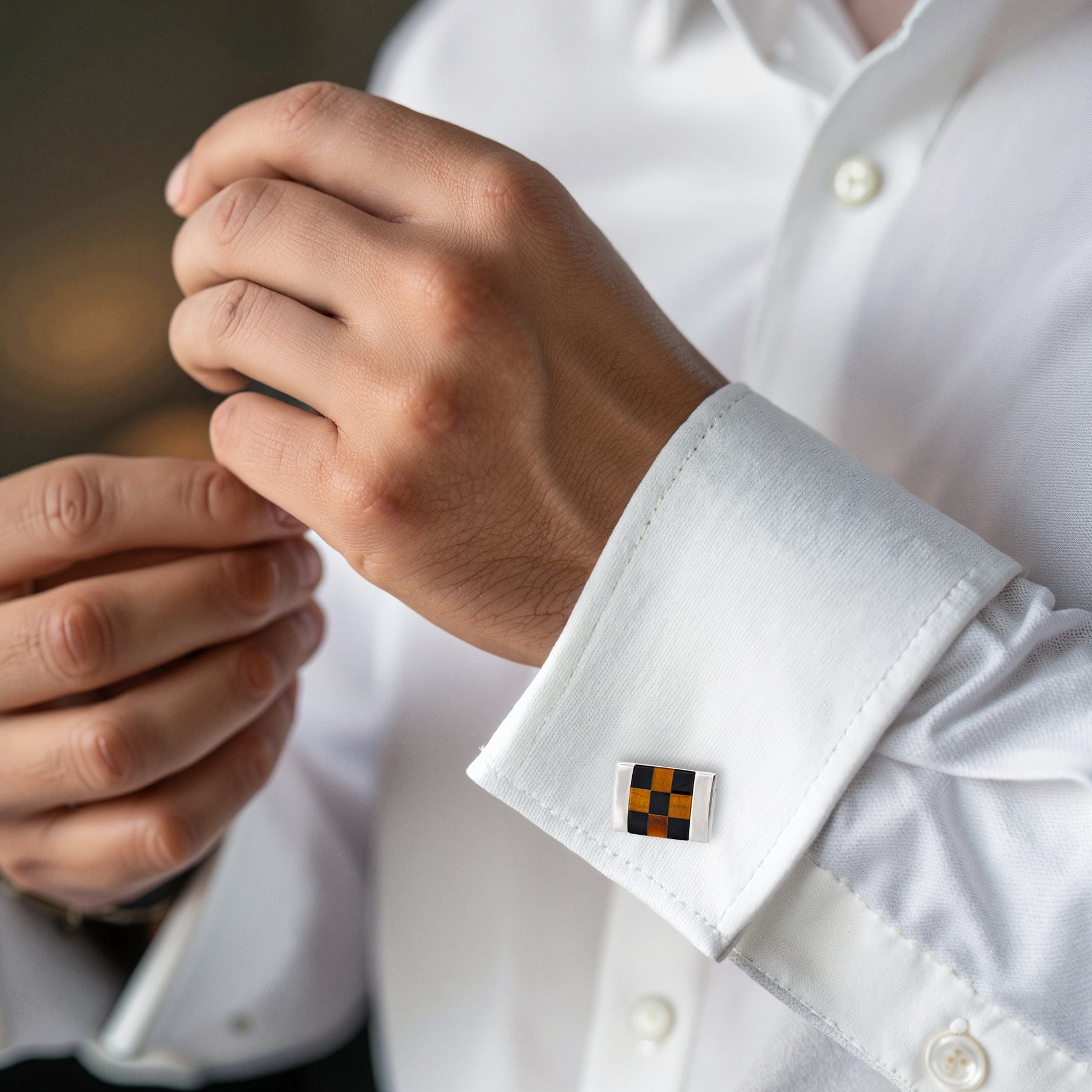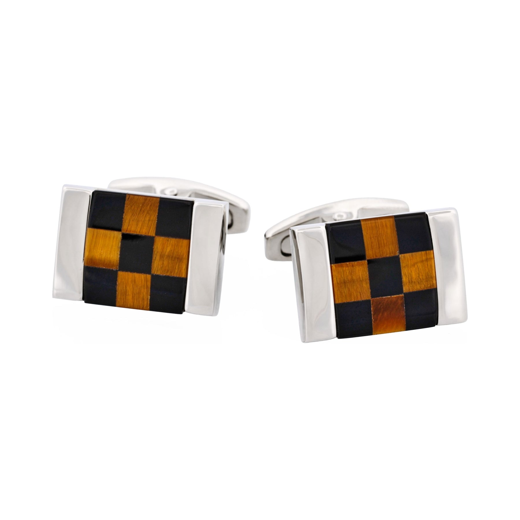 Add a dash of sophistication to your attire with the polished Rhodium Plated Square Tiger Eye & Onyx Check Cufflinks by Cudworth. Perfect for special events or daily wear, these cufflinks feature a unique check pattern using tiger eye and onyx stones. Securely set in rhodium plating, they offer an enduring lustre that won't tarnish over time.