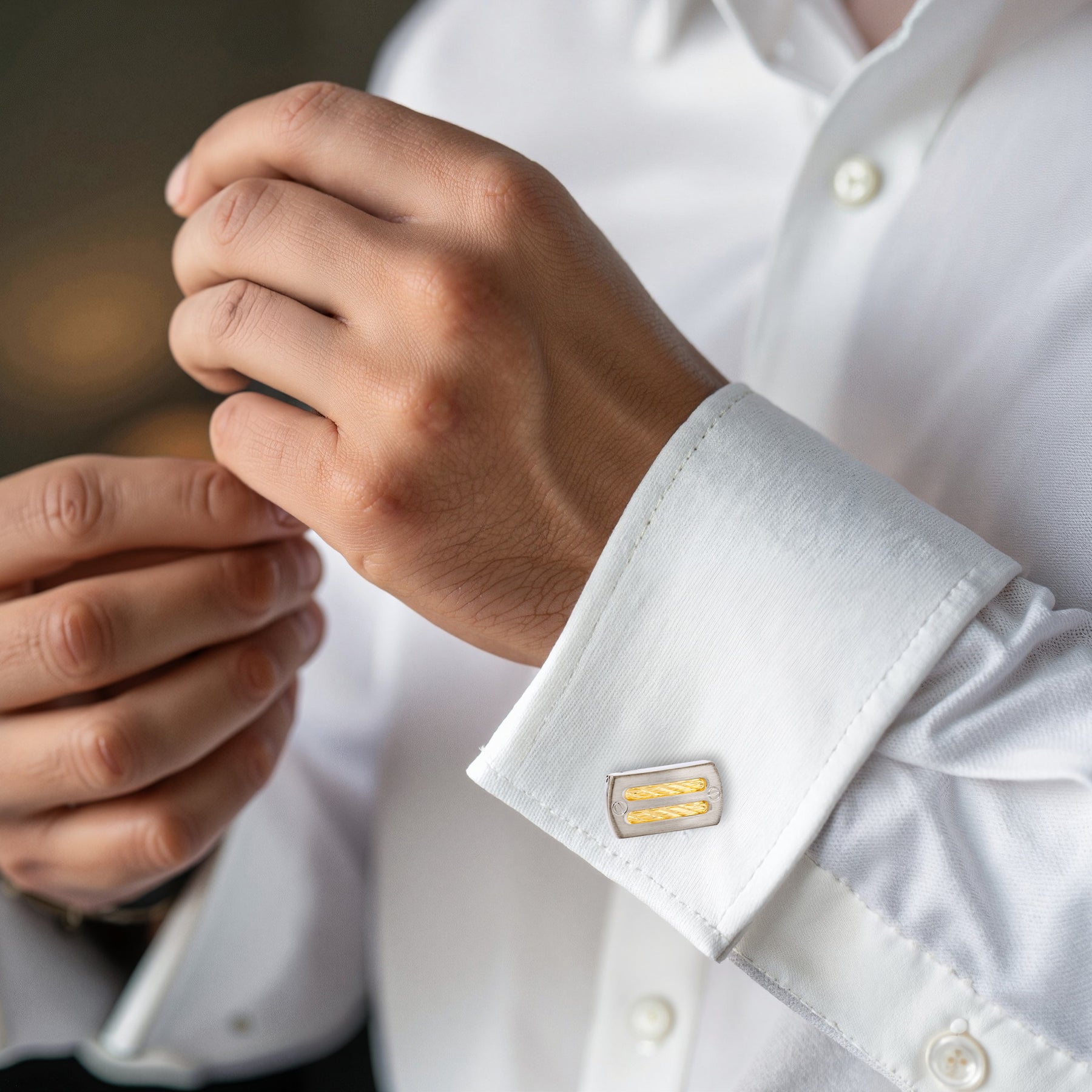 Add a touch of elegance to your ensemble with Cudworth's Rhodium & Gold Plated Cable Cufflinks. These stylish cufflinks feature a unique design that combines the cool shine of rhodium with the warmth of gold plating, creating an eye-catching contrast. Perfect for formal events or just to spruce up your everyday outfit, these cufflinks are versatile and sophisticated.