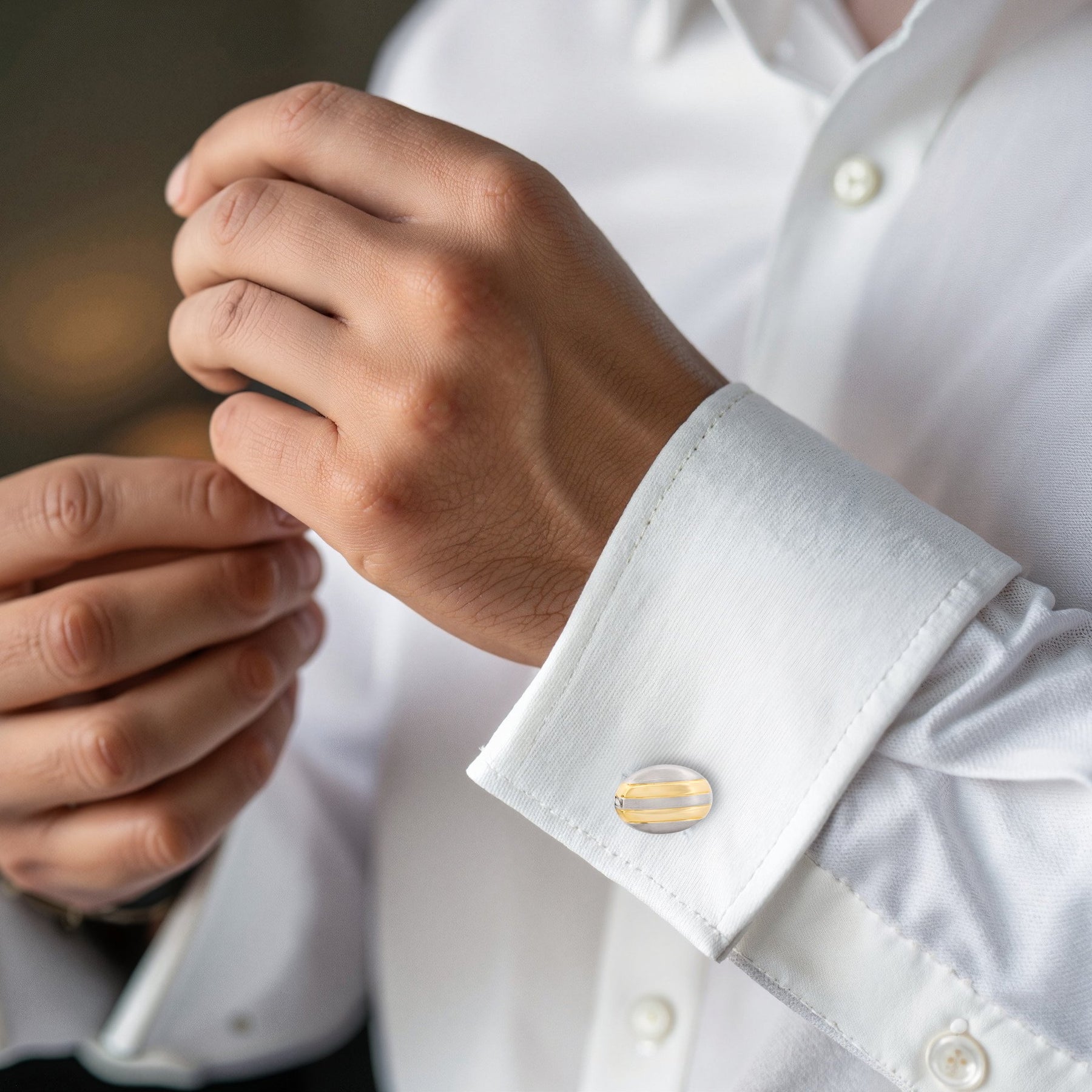 Add a touch of elegant sophistication to your formal attire with these Rhodium & Gold Striped Plated Oval Cufflinks from Cudworth. Their exquisite design features alternating stripes of rhodium and gold plating, ensuring they stand out subtly on any dress shirt. Perfect for those special occasions or as a thoughtful gift for the stylish gentleman.