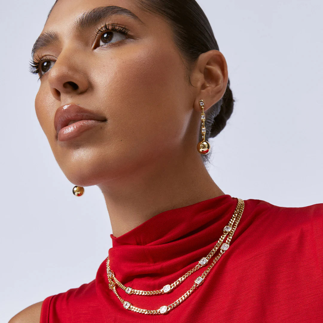 The Hazel Earrings by Zahar feature a polished gold-plated design with sparkling cubic zirconia stone accents and a sleek drop ball detail. They are an elegant and modern design, which is both versatile and timeless.