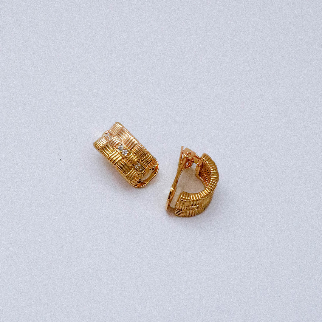 The Scarlett Earrings by Zahar feature a gold-plated design with intricate woven textures and sparkling cubic zirconia stone accents. Perfect for adding an elegant touch to your everyday or formal outfits, these earrings are timeless and versatile.