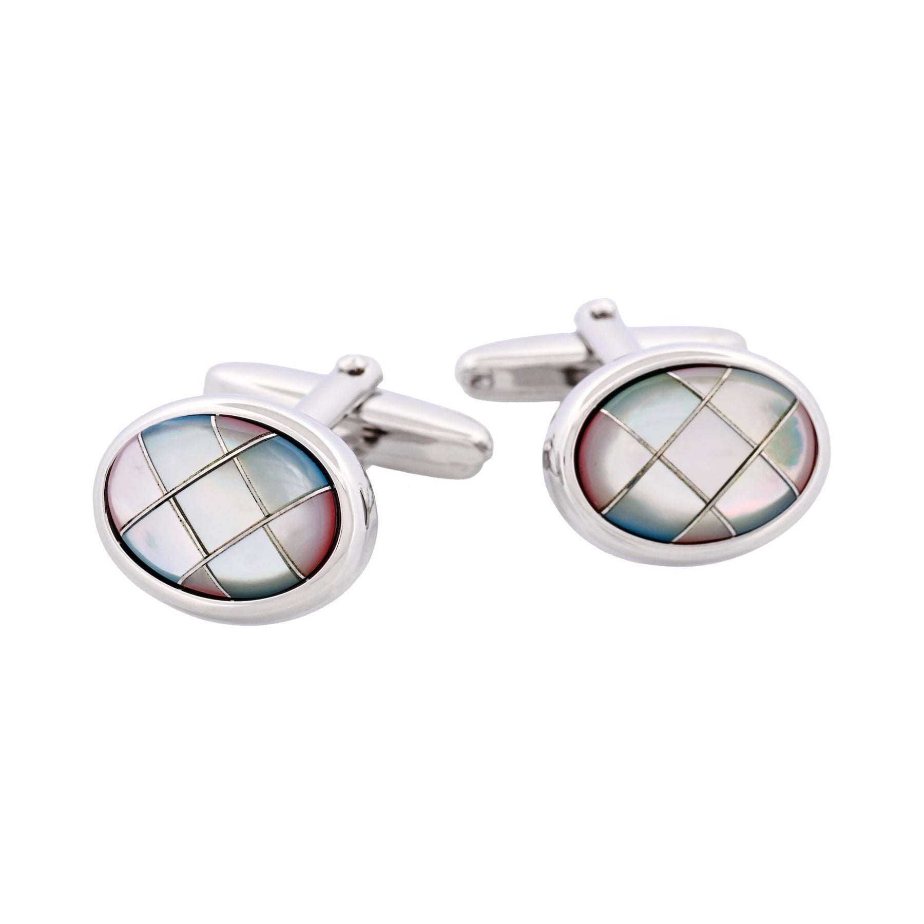 Presenting Cudworth's Polished Rhodium Oval Multicoloured Mother of Pearl Cross Patterned Cufflinks, a distinct fusion of elegance and masculinity. These cufflinks showcase a vibrant cross pattern set in mother of pearl, all encased in polished Rhodium for added sophistication. Ideal for formal events or simply upgrading your everyday ensemble, they make for a perfect addition to every gentleman's collection.