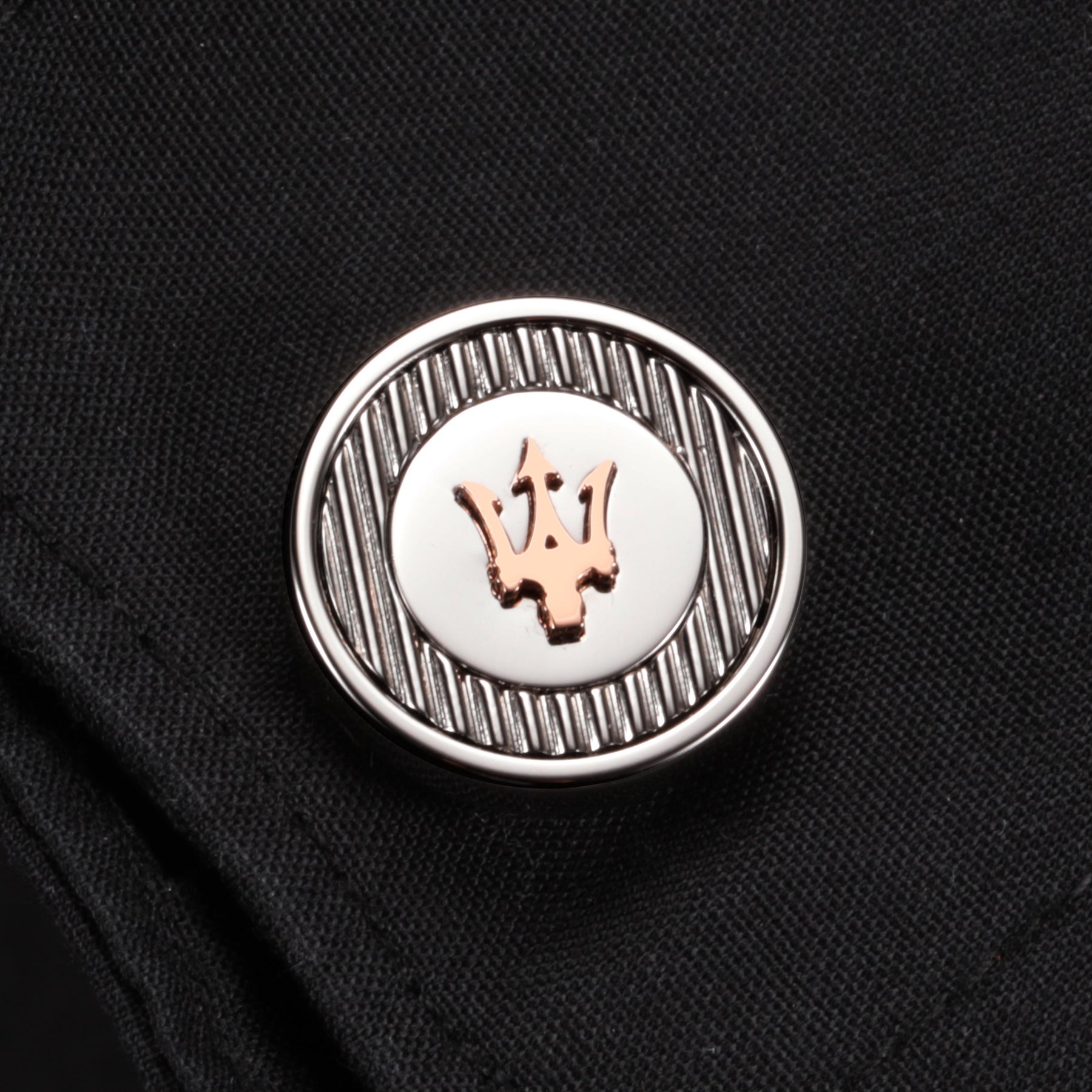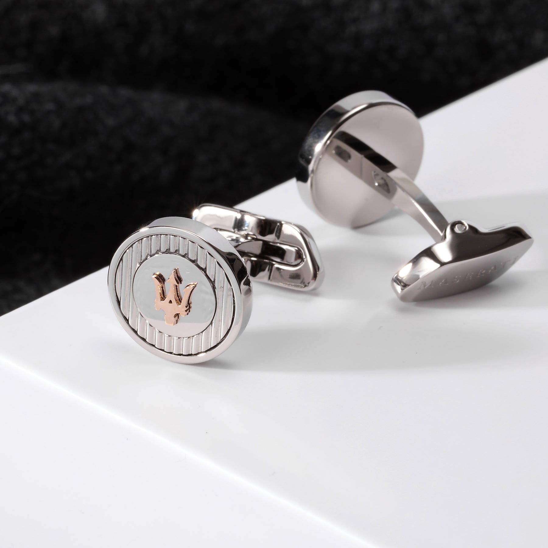Introducing the polished stainless steel Cufflinks, exuding timeless elegance and durability. Inspired by the prestigious Maserati brand, these cufflinks capture the essence of automotive sophistication, adding a touch of refined style to any formal attire.