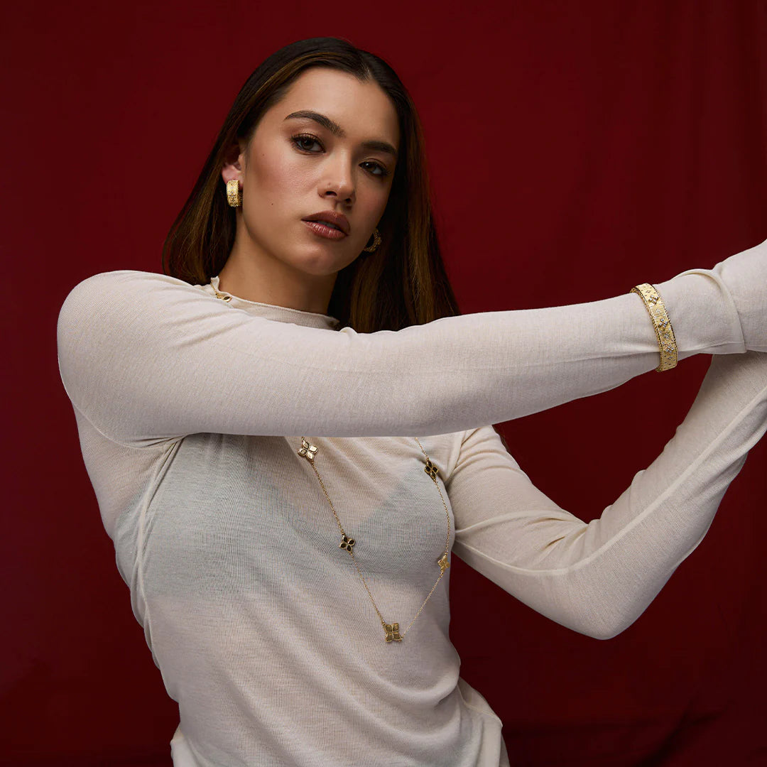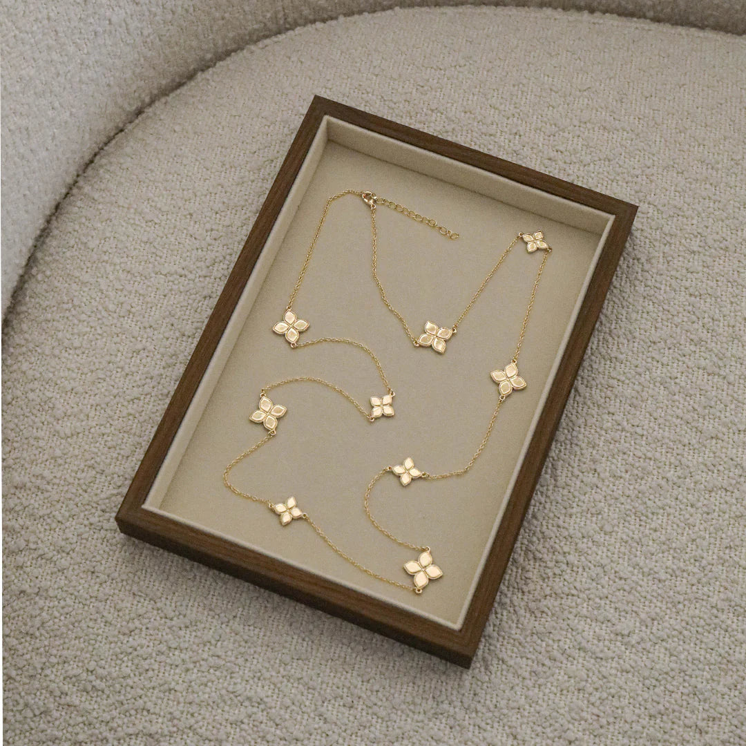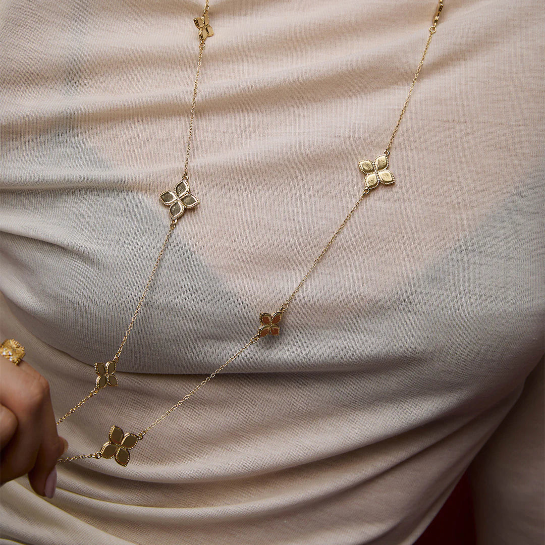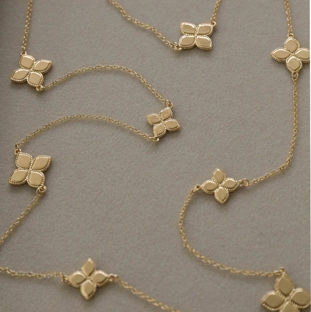 The Lainey Necklace by Zahar features a fine gold-toned chain adorned with intricate four-petal floral motifs spaced evenly throughout. A timeless piece perfect for layering or wearing on its own.