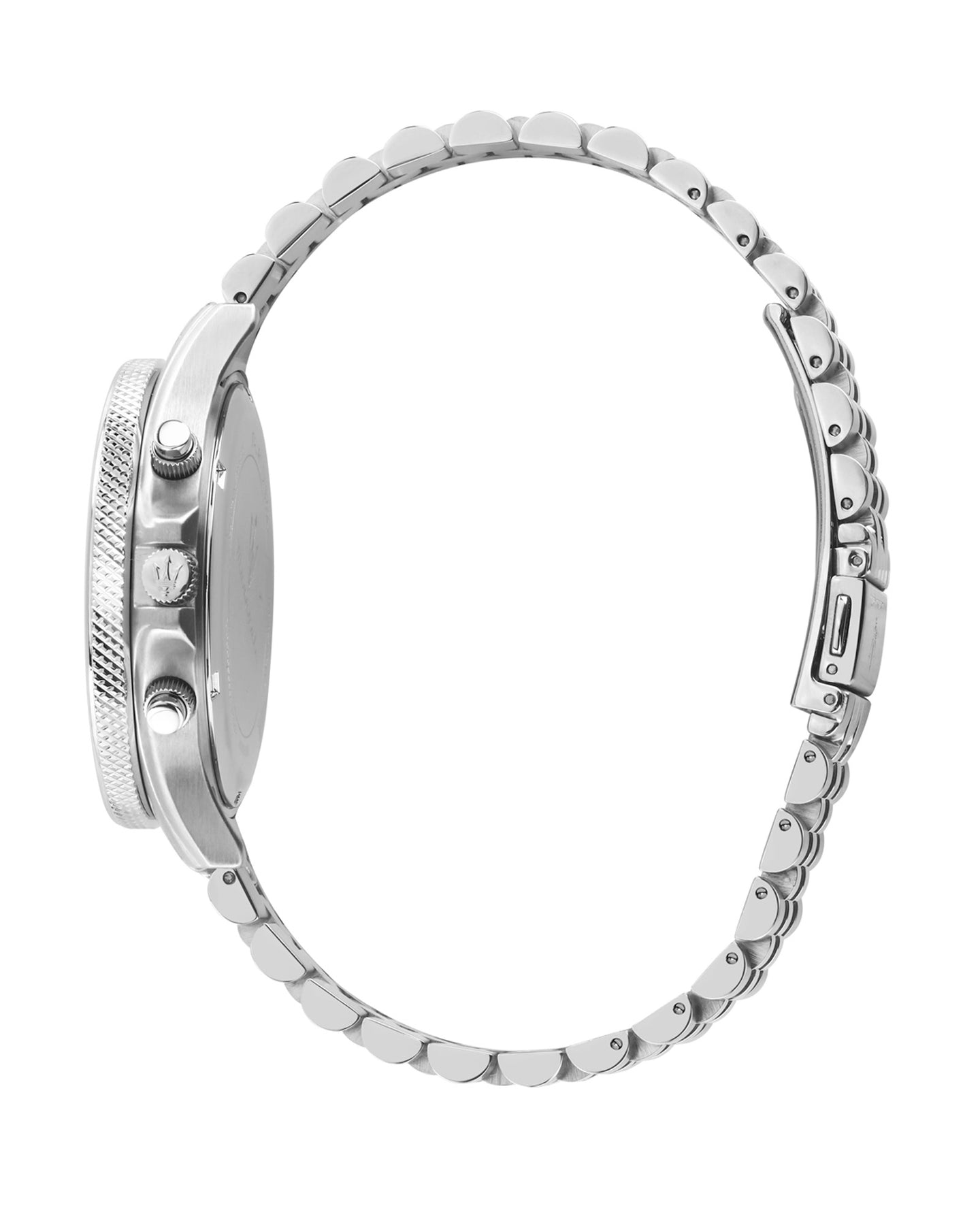 Maserati Sfida is a practical accessory for men. It will look great with both casual and elegant outfits. The heart of the watch is a precise automatic movement. The case is made of stainless steel of high quality covered with a black coating.A silver bracelet made of steel is easy to use and perfectly matches other elements of the watch. The black dial is covered by a mineral crystal, which is renowned for its high resistance to shocks and scratches that are caused during everyday use. A water resistance of 100 meters means the watch can be worn when swimming and freediving.