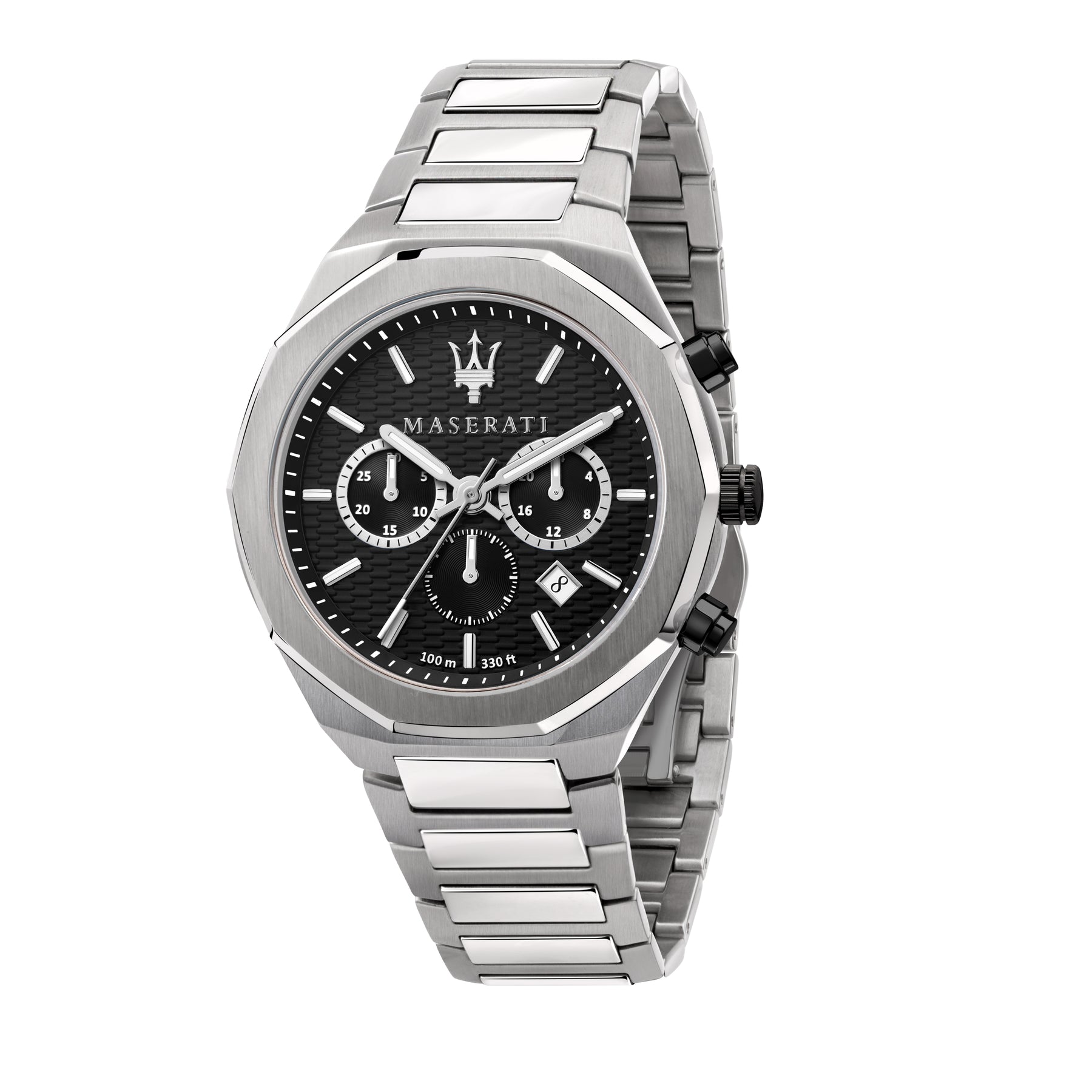 Presenting the Maserati Stile Silver Chronograph Watch. Welcome to the Maserati Stile Collection: watches that take up the mechanics, construction and stylistic codes of the iconic sporting watchmaking timepieces. The decisive lines, the distinctive decagonal bezel and the slim case are combined with details that strongly identify the sporting world such as: pump pushers, screw-down crown, multi-level dial, applied luminescent indexes, luminescent hands and a buckle with a personalised butterfly clasp featuring the applied Trident.- Materials: Stainless steel- Case size: 45mm